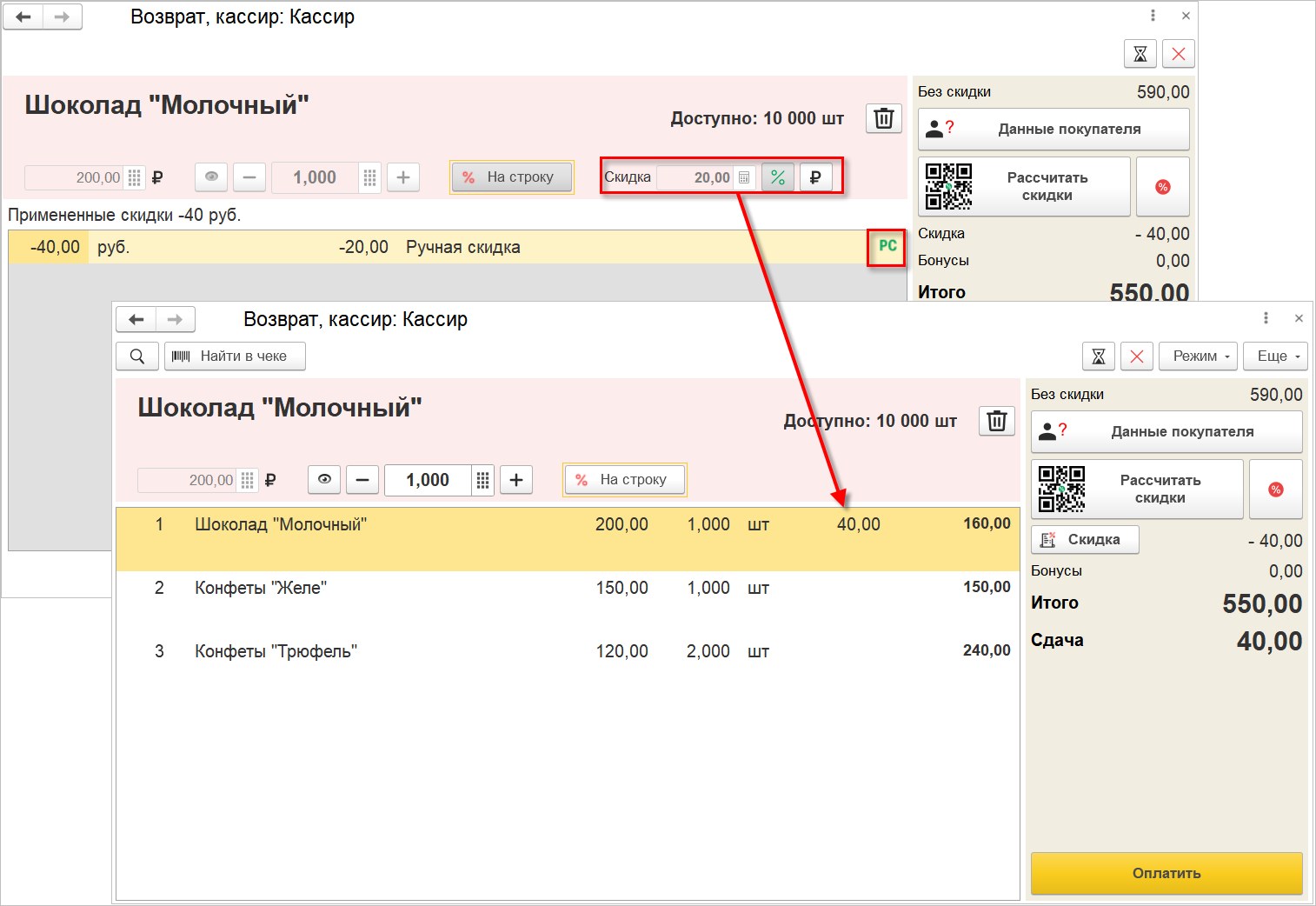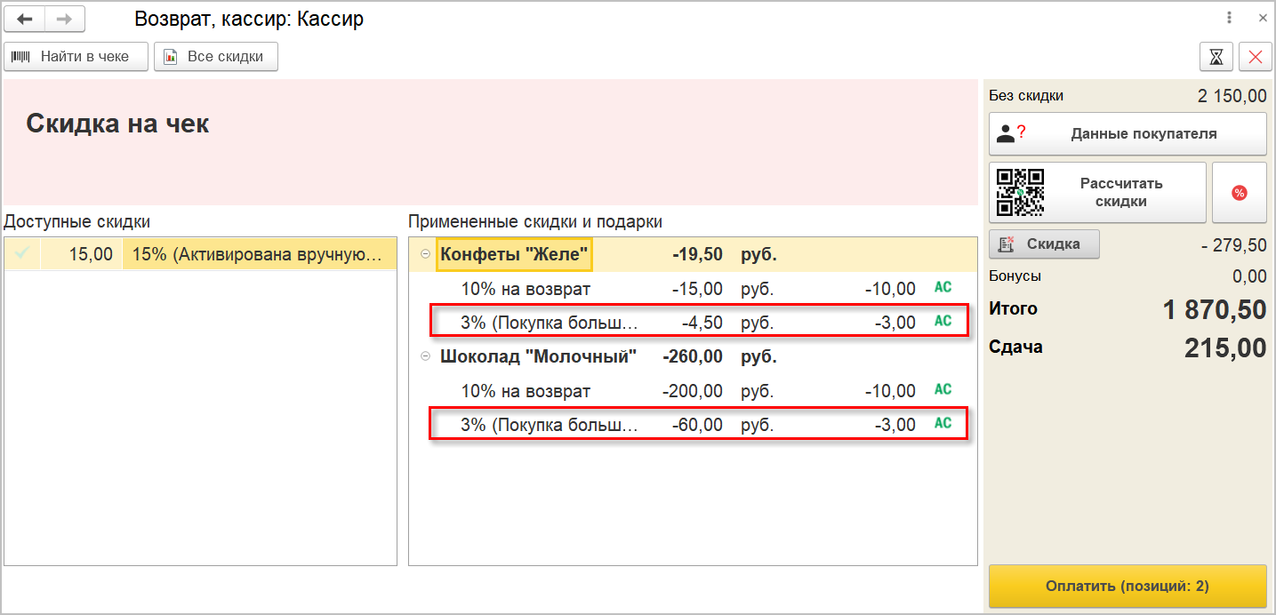 Как и при продаже, скидка на возврат может быть применена на строку и на весь документ, будут доступны кнопки управления скидками: рассчитать/отменить скидки.