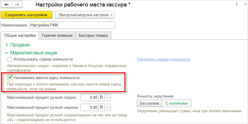 Если учет карт лояльности не ведется, то при загрузке настроек из XML игнорируется сохраненное ранее значение параметра "Напоминать ввести карту лояльности".