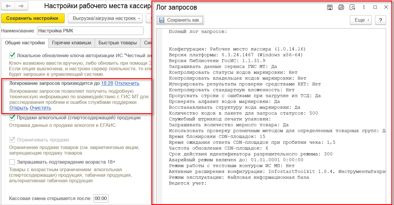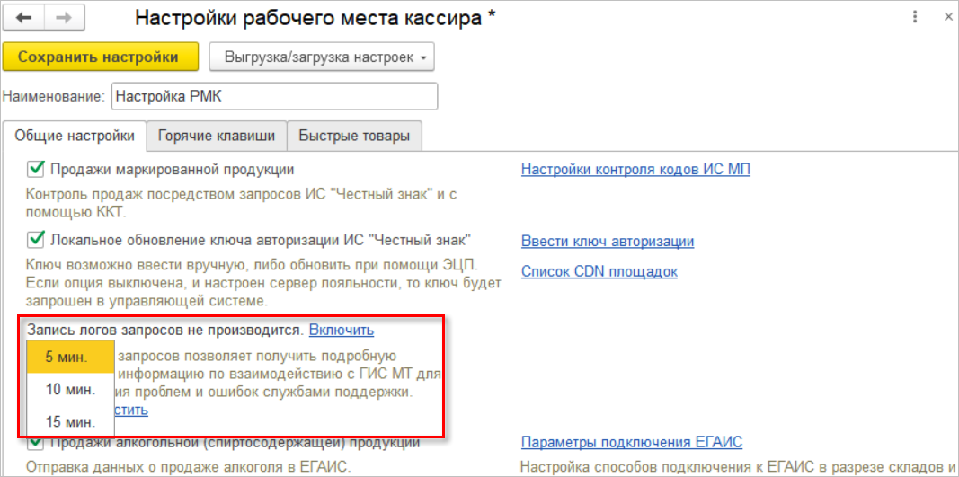 Добавлена возможность настройки дополнительного логирования запросов к ГИС МТ. Для записи логов необходимо перейти в раздел "Продажи" настроек РМК, для одноименной опции нажать ссылку "Включить" и выбрать длительность записи: 5, 10 или 15 мин.