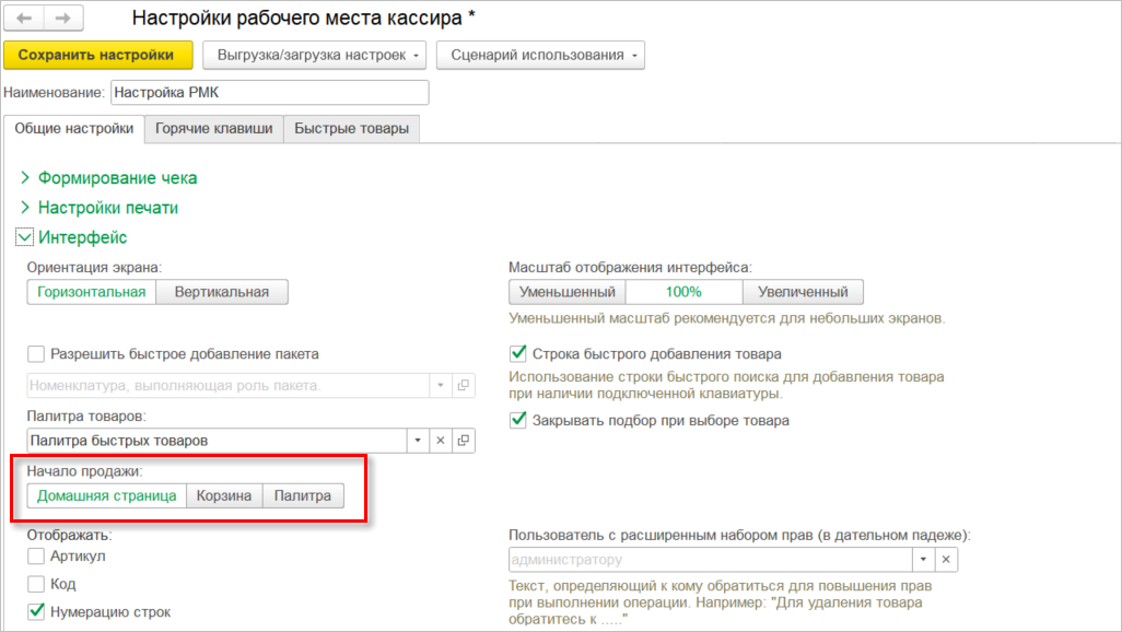 Теперь можно выбрать наиболее удобную для кассира форму для начала оформления продажи. В программе предусмотрено три режима для новой продажи: "Начальная страница", "Корзина" и "Палитра". В разделе "Интерфейс" настроек РМК нужно выбрать соответствующее значение для поля "Начало продаж".