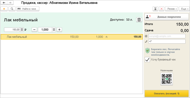 Дальнейший остаток наличных будет рассчитываться от данной суммы. Предполагается, что это разовая операция ввода начального остатка, но при необходимости сотрудник с соответствующими правами всегда сможет здесь же вручную скорректировать сумму.
