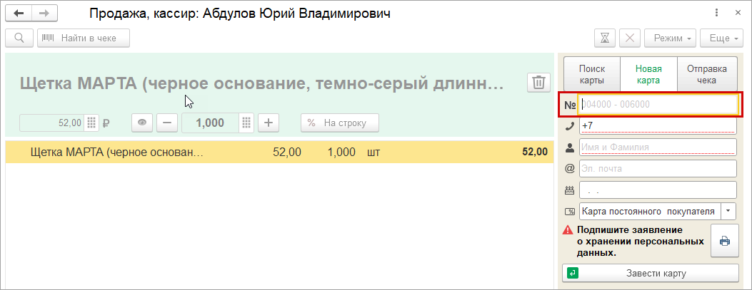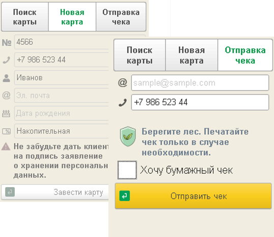 При регистрации новой карты лояльности введенные контактные данные клиента теперь автоматически подставляются в поля для отправки чека.