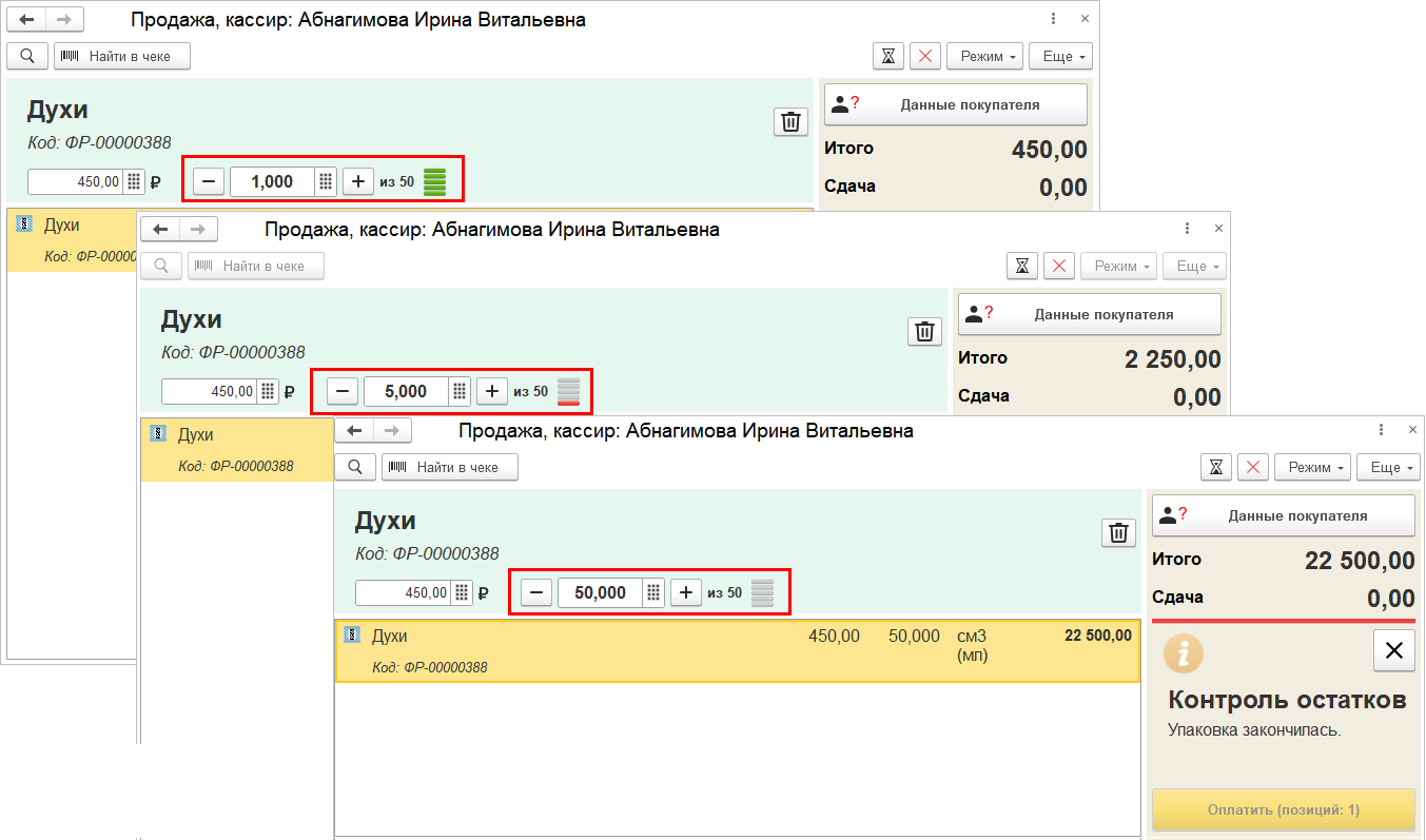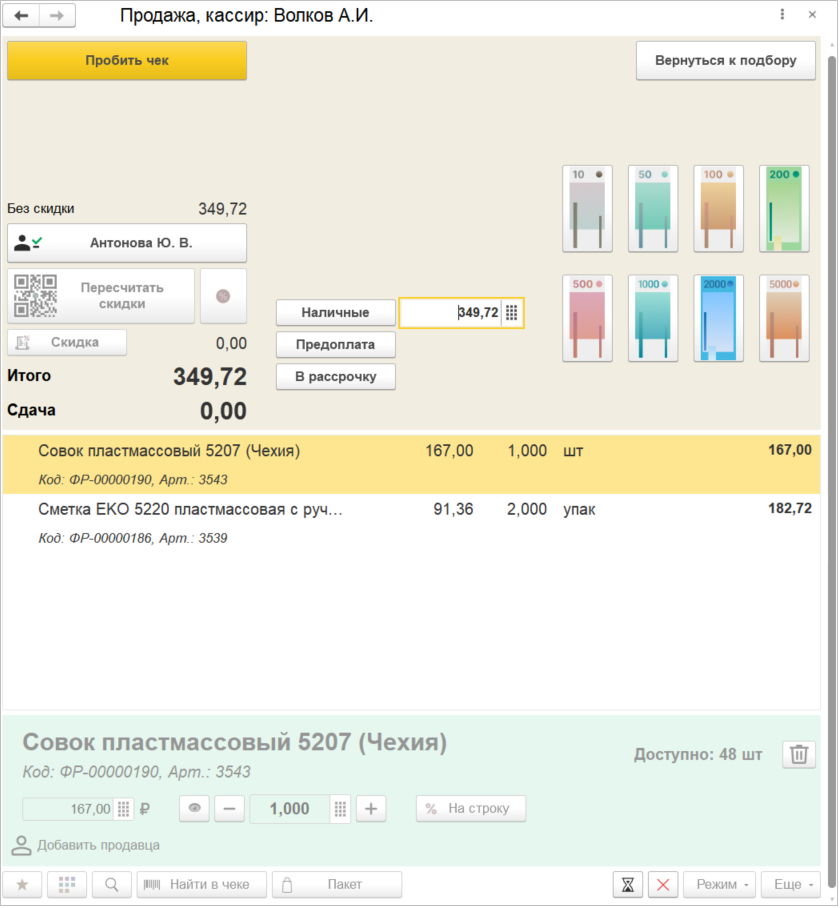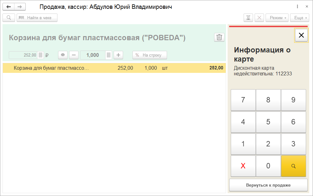 Аналогичное поведение предусмотрено для возврата товаров, продаж по заказу и при восстановлении отложенного чека.