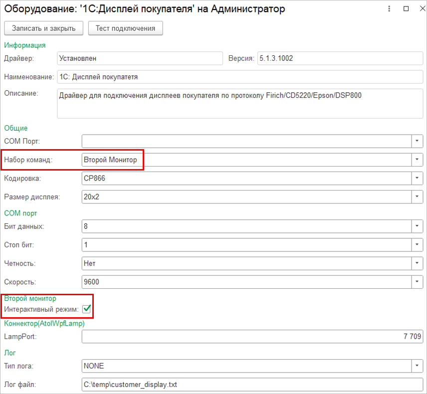Добавили возможность интерактивного взаимодействия с покупателем. Нажатием на экран клиент может напечатать копию чека при использовании дисплея покупателя в качестве второго монитора. Для этого в параметрах оборудования необходимо в разделе "Общие" для "Набора команд" выбрать значение "Второй монитор", а в разделе "Второй монитор" включить флажок "Интерактивный режим".