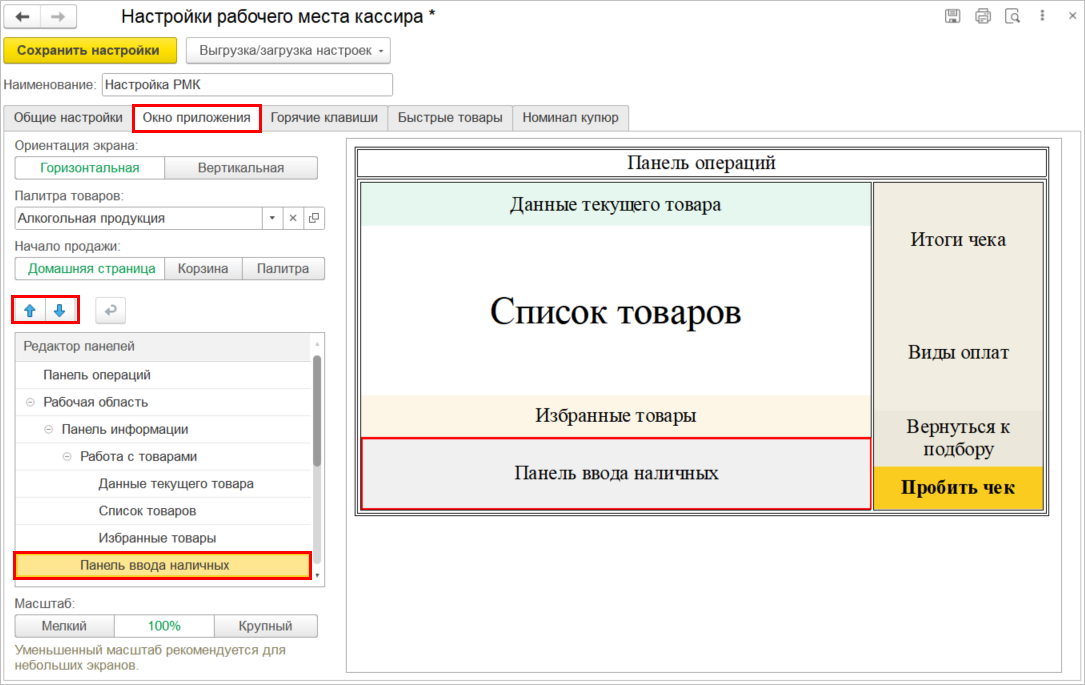 Теперь можно персонально настроить интерфейс рабочего места кассира. Для этого в настройки РМК добавлена отдельная страница "Окно приложения", на которой можно настроить оптимальное расположение групп элементов. Можно перемещать информационные панели в наиболее удобные места экрана, менять вложенные группы местами, выбирать масштаб, ориентацию экрана и другие параметры. При этом все изменения сразу будут видны на схеме предварительного просмотра.