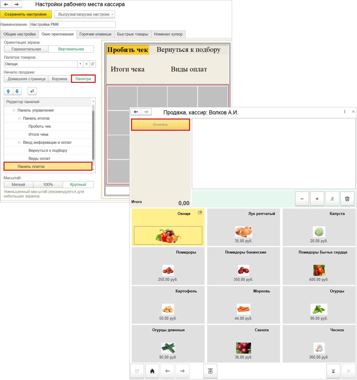 При работе в плиточном интерфейсе, когда установлен режим начала работы "Палитра", вместо области "Работа с товарами" отображается область "Панель плиток". На форме РМК список товаров располагается на месте "Панели управления", а кнопка "Оплатить" соответствует расположению области "Пробить чек".