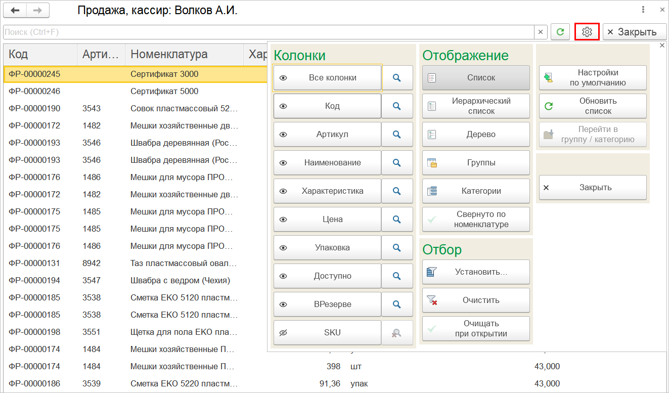 Для настройки списка в каталоге товаров нажимаем кнопку в виде "шестеренки". В открывшейся форме все настройки объединены в функциональные группы, что поможет быстрее сориентироваться в большом количестве настроек.