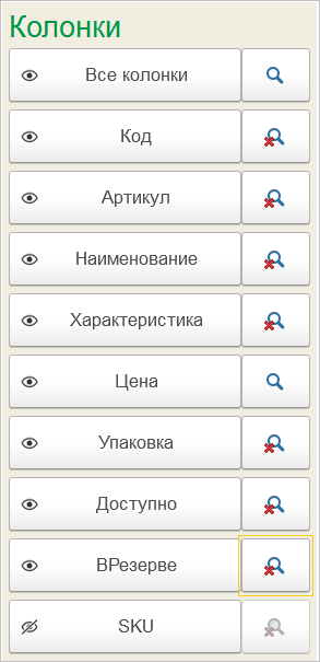 В группе "Колонки" отображаются все доступные колонки формы подбора. Нажимая на "око" можно переключать отображение каждой колонки. Можно оставить только нужные колонки, разгрузив рабочую область. Удобно при использовании маленьких экранов. Видимость колонки SKU отключена по умолчанию, но при необходимости ее можно включить.