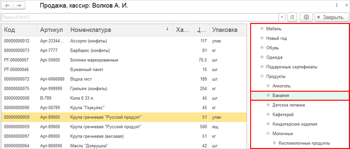 В вариантах "Иерархический список" и "Дерево" отображения строки, имеющие одну номенклатуру и различные характеристики, серии или упаковки, свернуты по номенклатуре и сначала отображается одна общая строка без цены. Она будет подсвечена серым. При ее выборе отобразится "Список" со всеми характеристиками, сериями и упаковками по выбранной номенклатуре с ценами. Таким образом, один и тот же товар не будет дублироваться в общем списке, что удобно, если активно используются комбинации формата "номенклатура+серия", "номенклатура+упаковка" и др.