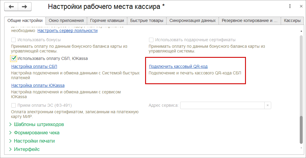 В форму настройки рабочего места кассира добавлена настройка кассового QR-кода СБП для подключения и настройки печати кода. К настройке можно перейти по ссылке "Подключить кассовый QR-код" в группе настроек "Виды оплат" на закладке "Общие настройки". После установки флажка "Использовать оплату СБП, ЮKassa" ссылка станет активной. По ссылке открывается форма подключения кассового QR-кода с выбранной кассой.