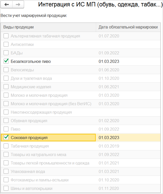 Как и для других категорий, включение новых видов маркируемой продукции осуществляется в форме настройки интеграции с ИС МП.