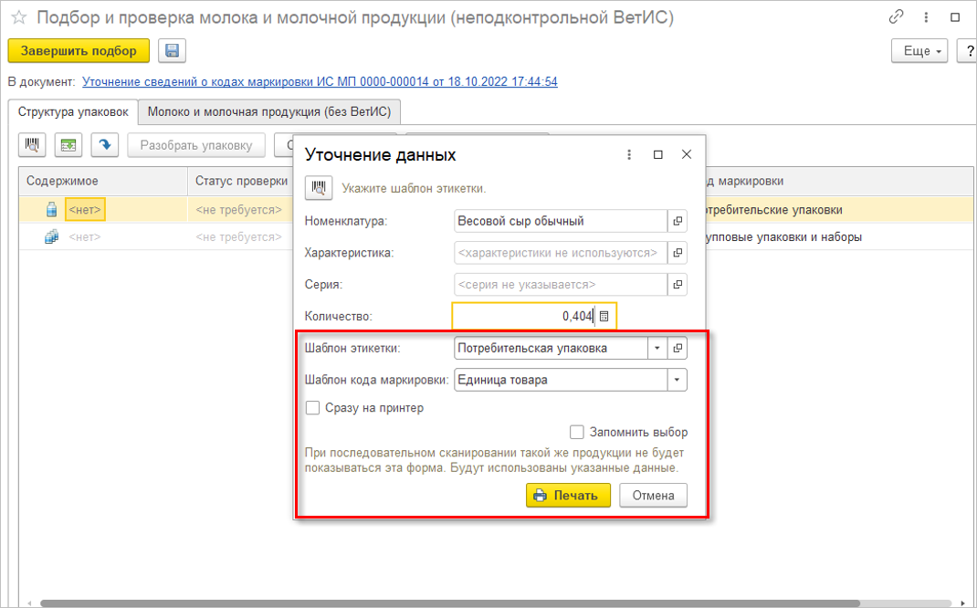 При сканировании полного кода, содержащего идентификатор веса «3103», в форме уточнения данных доступна кнопка Печать. Коды без идентификатора «3103» распечатаны типографским способом, поэтому не требуют повторной печати.