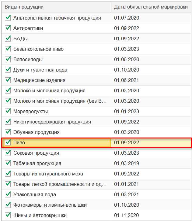 Напомним, что первоначально нужно включить учет маркируемой продукции «Пиво». Для этого в разделе «Администрирование» – «Интеграция с ИС МП» необходимо установить соответствующий флажок и дату обязательной маркировки.