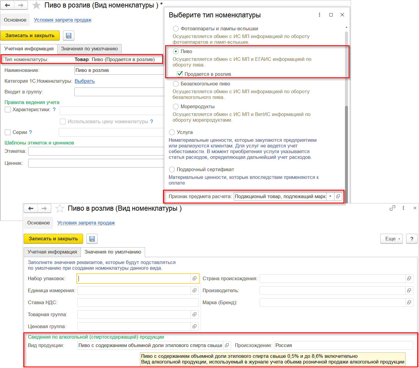 Затем рекомендуется настроить две карточки справочника «Виды номенклатуры» с типом номенклатуры "Пиво". Первую - для пива, продаваемого в розлив, с флажком "Продается в розлив". Вторую - для нераспакованного пива в кеге, без флажка "Продается в розлив". При этом признак предмета расчета автоматически примет значение "Подакцизный товар, подлежащий маркировке средством идентификации, имеющий код маркировки". На вкладке "Значения по умолчанию" нужно заполнить дополнительные сведения по алкогольной (спиртосодержащей) продукции.