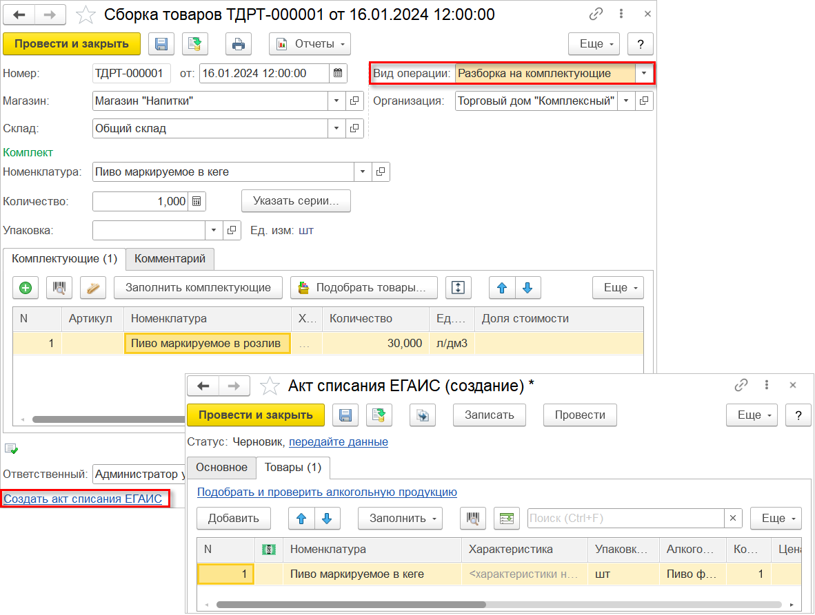 После получения входящего электронного УПД от поставщика в созданном документе «Поступление товаров» потребуется считать марки полученных кегов. При передаче кега в торговый зал рекомендуется использовать документ "Сборка товаров" с видом операции "Разборка на комплектующие", который отразит факт вскрытия тары. При проведении документа автоматически будет сформирована гиперссылка для создания документа "Акт списания ЕГАИС", предназначенного для отражения выбытия алкогольной продукции.