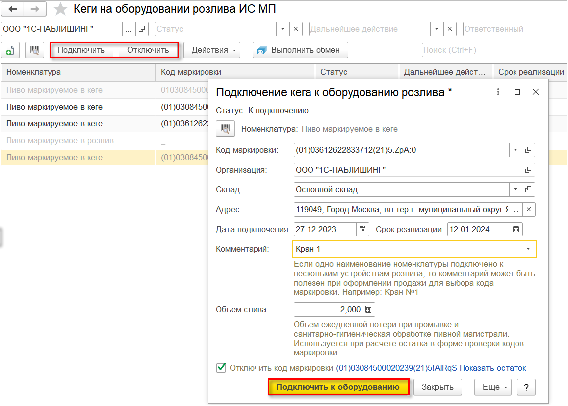 В соответствии с новыми правилами с 15 января 2024 г. участники оборота, осуществляющие розничную продажу пива в розлив, должны передавать в ГИС МТ информацию при подключении каждого кега к крану и сведения о частичном выбытии пива при реализации в розлив. В связи с этим в новой версии программы была поддержана работа с оборудованием розлива пивной продукции, в том числе ручная и автоматическая фиксация подключения и отключения кега к крану. Автоматическое заполнение кода маркировки пивной продукции, реализуемой в розлив, поддержано в новом и старом РМК, а также в документе «Чек ККМ». Процесс работы с оборудованием розлива автоматизирован и при совместной работе программы с автономным 1С:РМК.