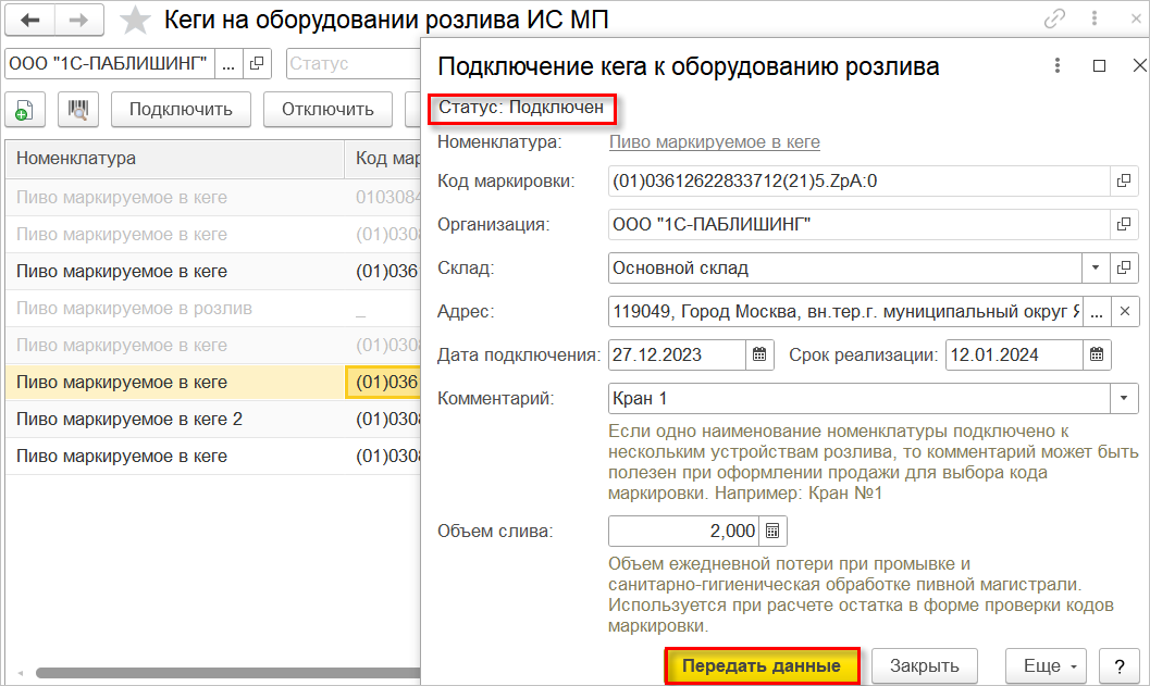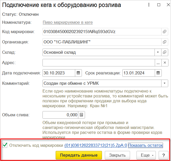 После этих действий код маркировки перейдет в статус «Подключен», и с этого момента его уже можно использовать для оформления продаж. После подключения кега пользователю потребуется передать отчёт о подключении в ГИС МТ с помощью одноименной команды меню «Действия» в общем списке документов или кнопки «Передать данные» в самом документе.
