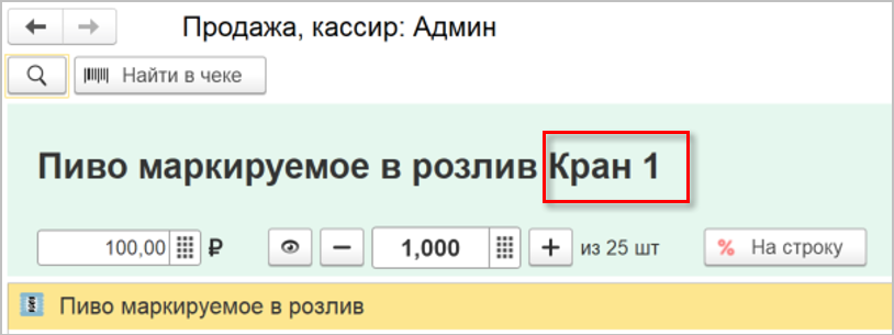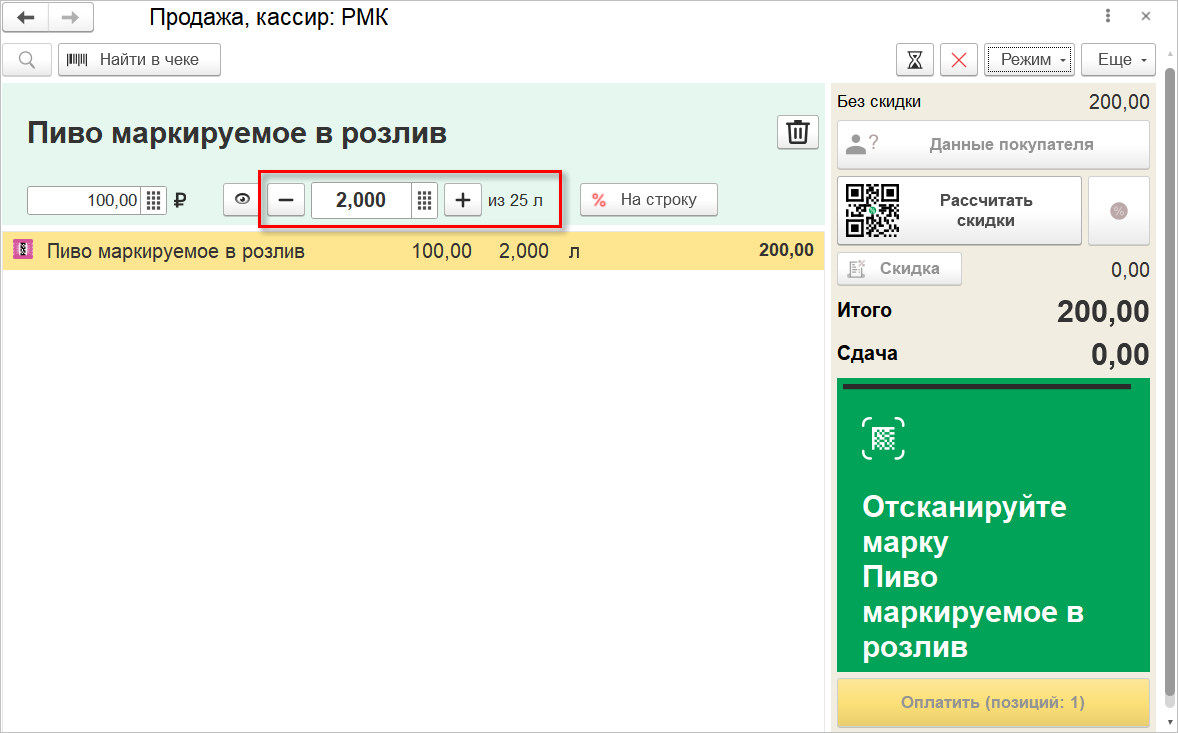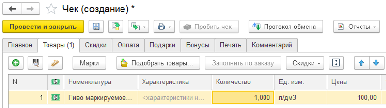 Для оформления розничной продажи используется номенклатура, учитывающаяся в литрах с признаком «В розлив». Подбирать товар можно вручную или сканированием штрихкода ean, при этом кассиру потребуется уточнить продаваемое количество. Справа от количества будет отображаться объем тары.