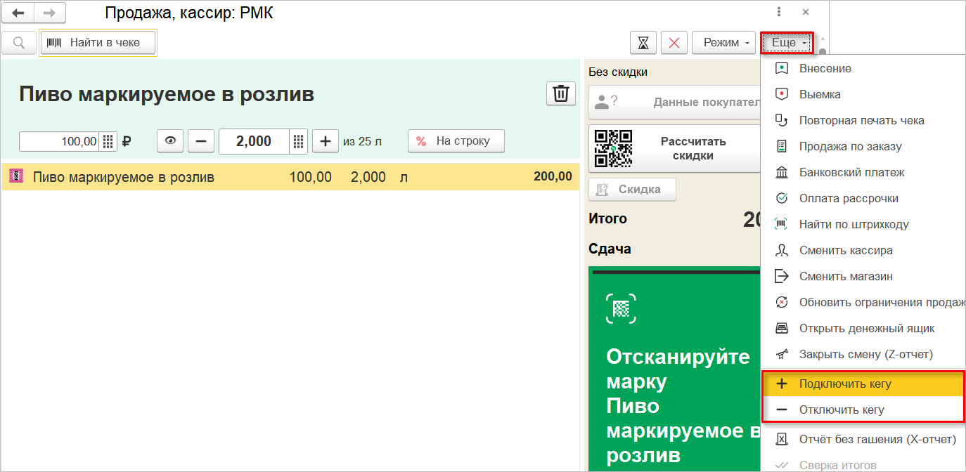 Также и в старом РМК и "Чеке ККМ" при ручном добавлении пивной продукции, реализуемой в розлив, и при изменении количества, автоматически подбирается код маркировки, если он является единственным подключенным к оборудованию розлива.