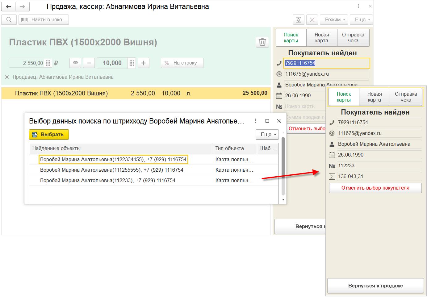 Улучшен процесс взаимодействия с постоянными клиентами. Теперь, если у покупателя несколько карт лояльности, то при выборе контрагента в РМК кассиру будет предложено выбрать конкретную карту. Если карта одна, то данные покупателя заполнятся по умолчанию.
