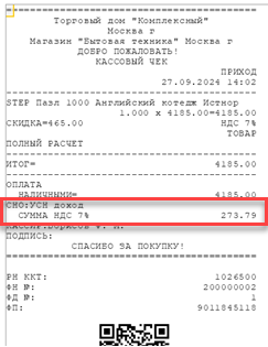 ВНИМАНИЕ! Для того, чтобы ставка и сумма НДС были выведены в чек, необходимо, чтобы на подключенном кассовом аппарате была обновлена прошивка, на компьютере была установлена соответствующая прошивке версия драйвера и весь комплекс был сертифицирован 1С. Со списком сертифицированного оборудования можно ознакомиться на сайте 1С, за обновлением программного обеспечения кассового аппарата следует обратиться к производителю кассы.