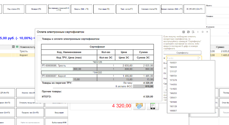 Поддерживается такой же режим оплаты по номеру сертификата и в документе Чек