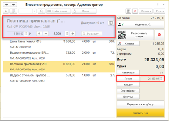 Переключение в режим предоплаты возможно и на стадии сформированного чека,
