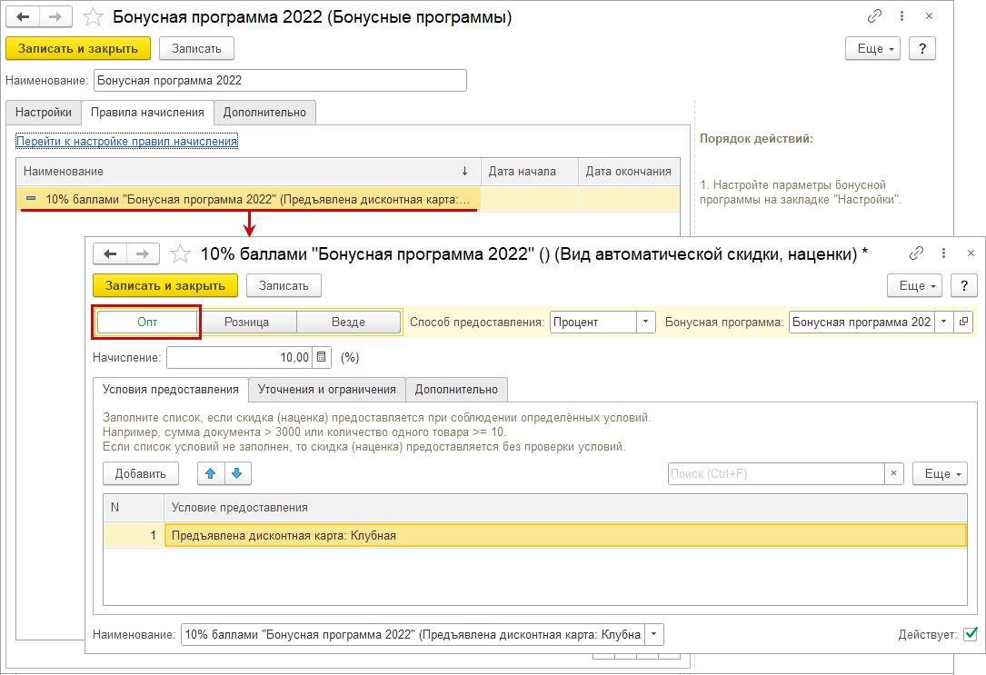 Для использования бонусной программы в оптовых продажах указываем в правилах начисления автоматической скидки вариант использования "Опт" или "Везде".