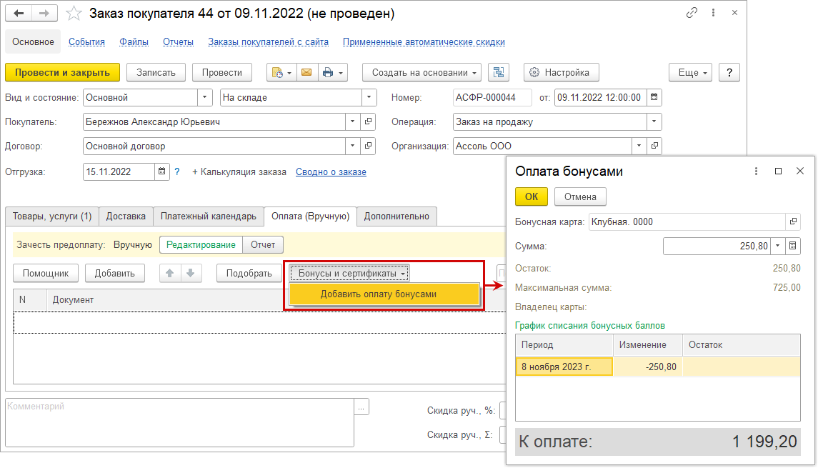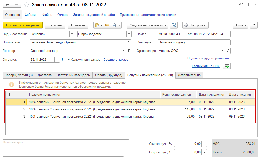 В документе "Заказ покупателя" выполняется предварительный расчет бонусных баллов к начислению. Реальное начисление выполняется в момент отгрузки по данному заказу и отражается документами: "Расходная накладная", "Акт выполненных работ".