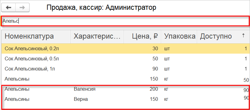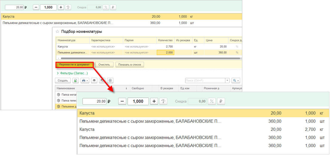 Найденная упаковка будет добавлена в табличную часть документа.