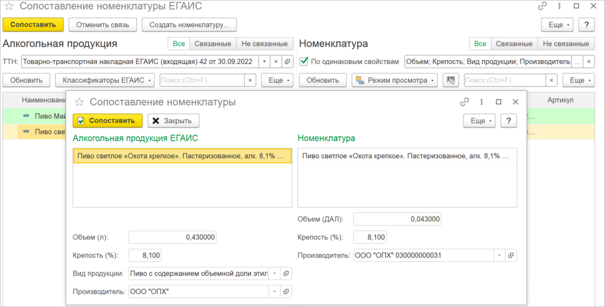 Перед сопоставлением будет выведена форма контроля соответствия данных алкогольной продукции и номенклатуры.