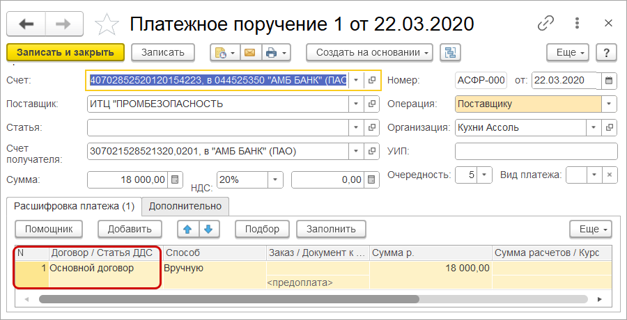 Работать с платежными поручениями в клиент-банке стало удобнее. Теперь поле «Договор» в платежном поручении располагается в табличной части аналогично документу "Расход со счета".