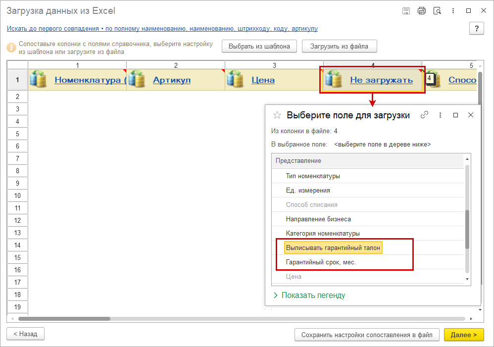 Теперь можно загружать реквизиты гарантий для номенклатуры. Появилась возможность сохранять настройки сопоставления колонок в файле и загружать из файла.