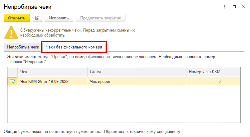 Чеки без фискального номера можно удалить или присвоить им номер при пробитии на оборудовании.