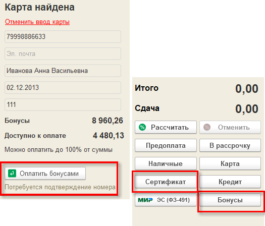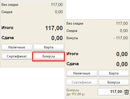 Списание бонусных баллов отражается на вкладке "Оплата" с помощью кнопки Бонусы и сертификаты.