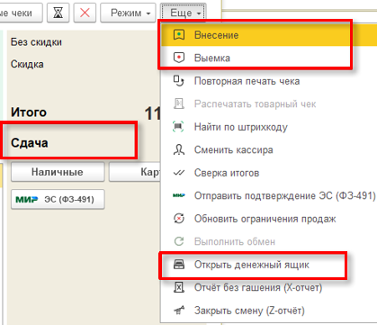 В привычном виде доступна вся необходимая функциональность: открытие и закрытие смены, пробитие чеков, внесение и выемка денежных средств.