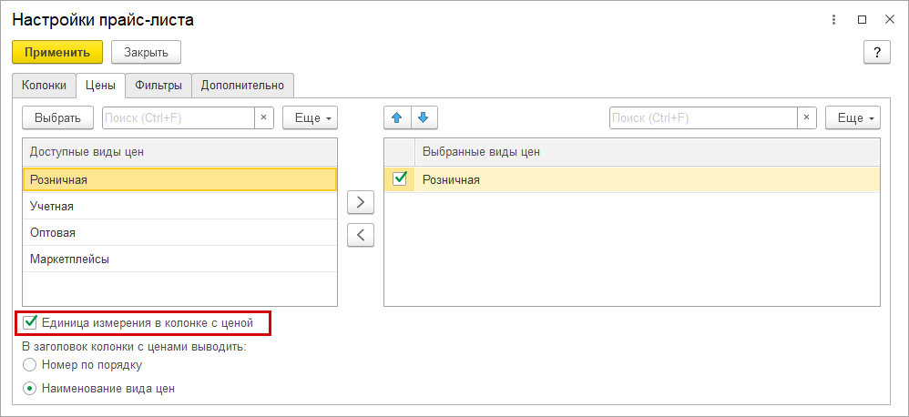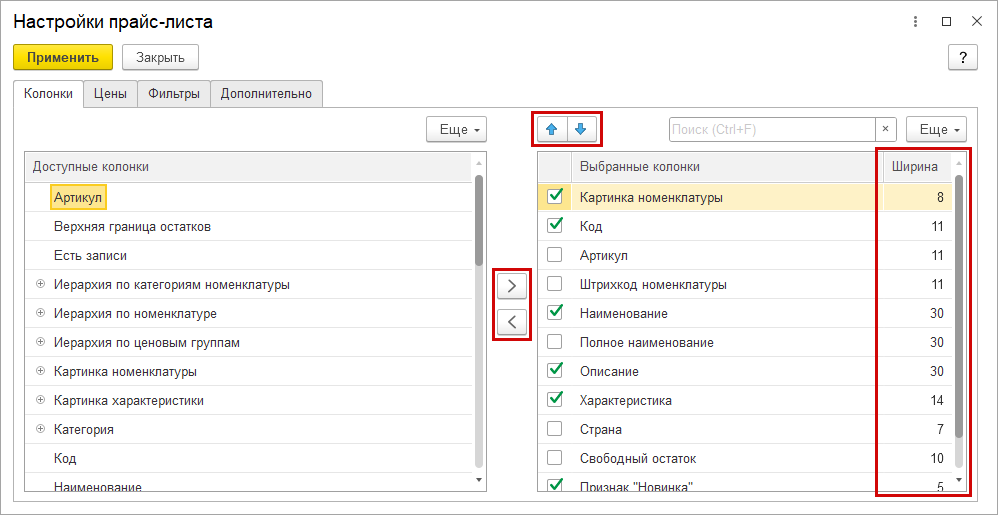 Настройка колонок выполняется на правой панели прайс-листа по ссылке в группе "Колонки".