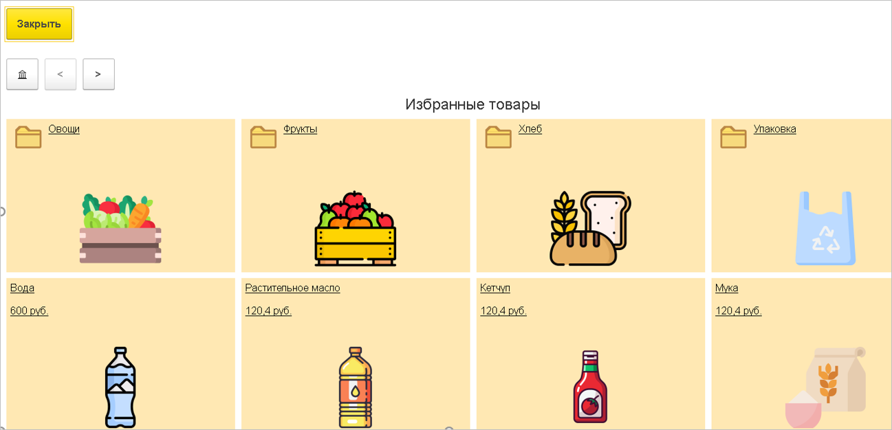 Форма плиточного интерфейса подбора товаров содержит командную панель, с помощью которой можно переходить по страницам и вернуться на начальное положение. Также можно перейти к подбору товара из каталога в форме списка.