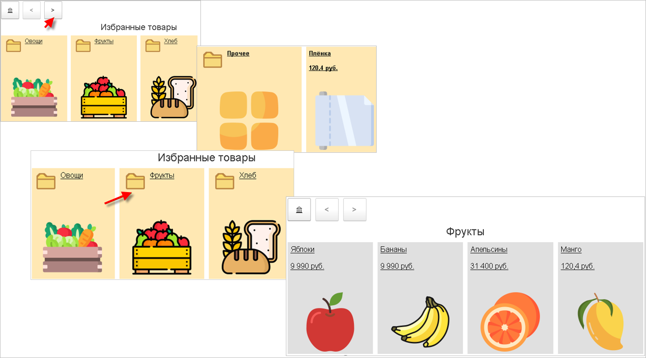 Товары на экране могут быть представлены в виде изображений, выбор товара осуществляется нажатием на экран.