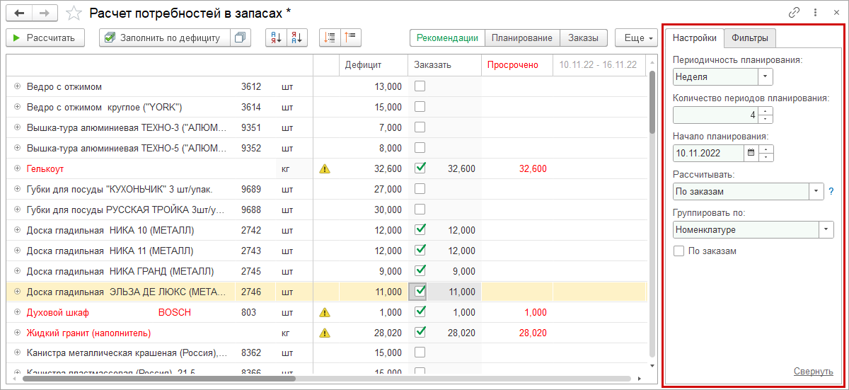 Сортировка товаров в "Расчете потребностей"