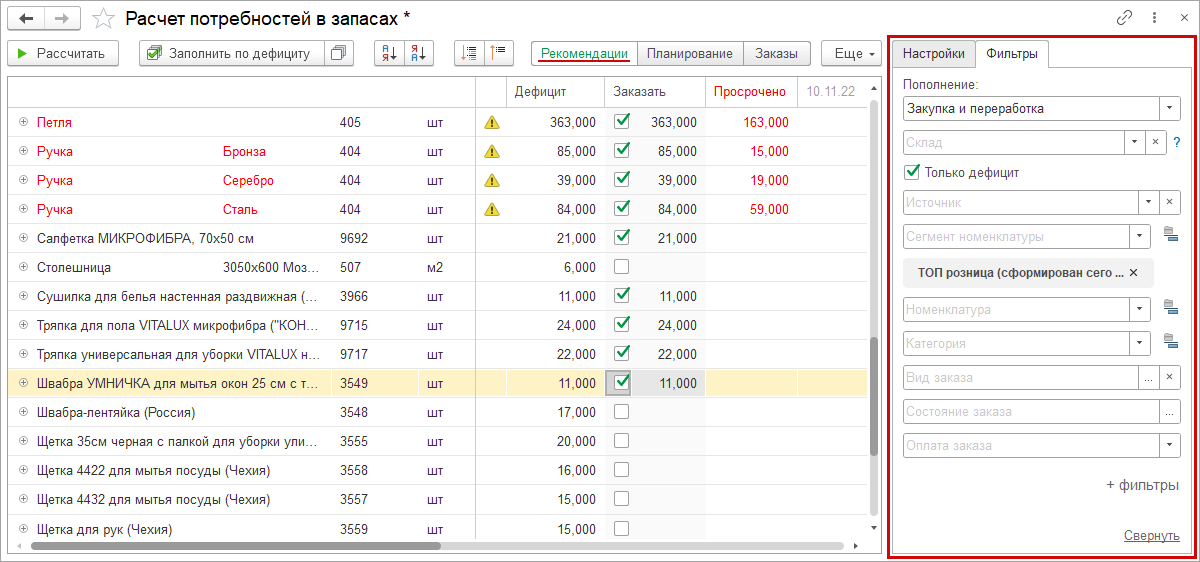 Добавили новый фильтр "Сегмент номенклатуры". С его помощью можно быстро запланировать пополнение товаров определенного сегмента. Например, организовать закупку самых популярных товаров месяца.