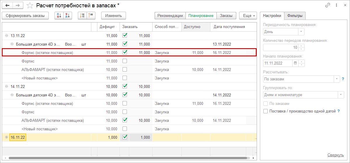 Товары, которые есть в наличии на складах поставщика, теперь отображаются в расчете потребностей в первую очередь. Таким образом, можно быстро сформировать заказы с учетом приоритетных поставщиков, наличия у них конкретных товаров и сроков пополнения.