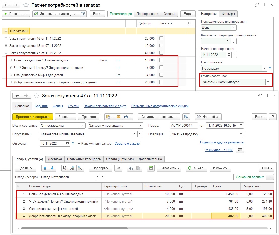 "Расчет потребностей" с группировкой "По заказам и номенклатуре" сохраняет порядок товаров в заказе.