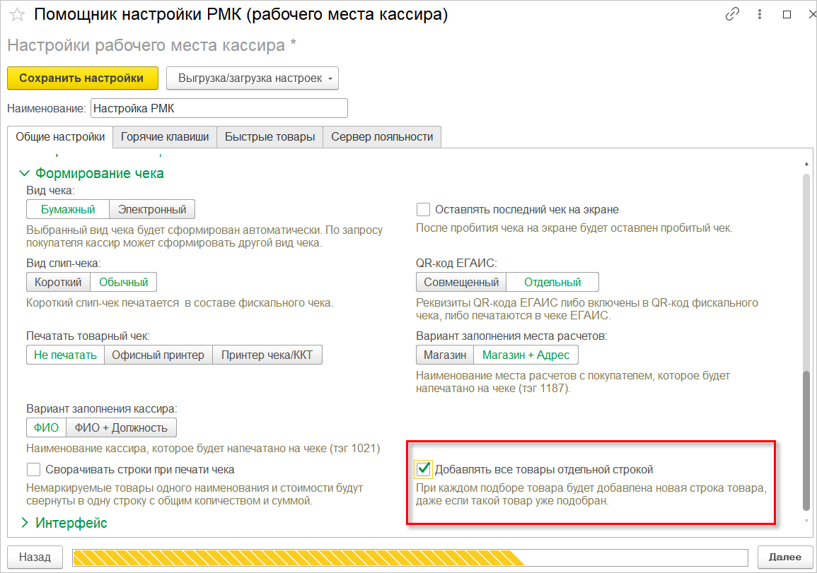 Добавить товар в палитру можно в разделе "Интерфейс" настроек РМК любым удобным способом: сканированием штрихкода, из формы подбора, стандартной командой Добавить.