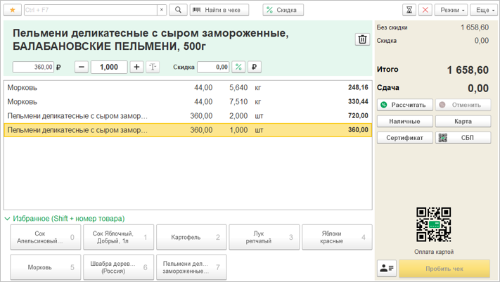 Выбираем товар в плиточном каталоге и далее взвешиваем товар в чеке.