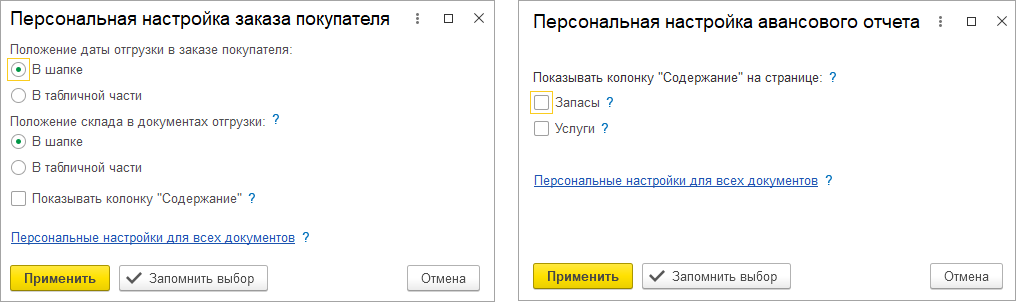 В форме Шапка/Табличная часть документов добавлена ссылка на персональные настройки пользователя.
