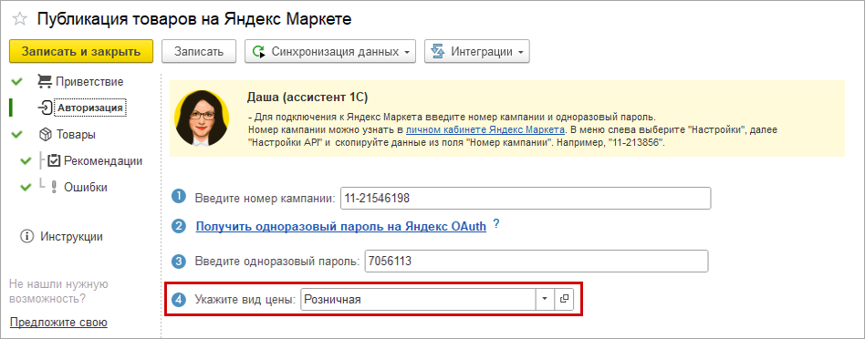 На этапе настройки "Авторизация" на форму добавился новый пункт "Укажите вид цены", в котором подбираем прайс-лист для маркетлейса.