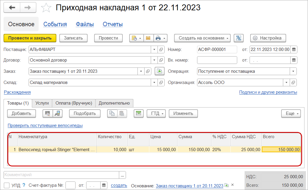 Например, оформили поступление товара приходной накладной на 150 000 руб.