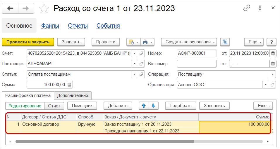 С расчетного счета оплатили часть товаров на 100 000 руб.
