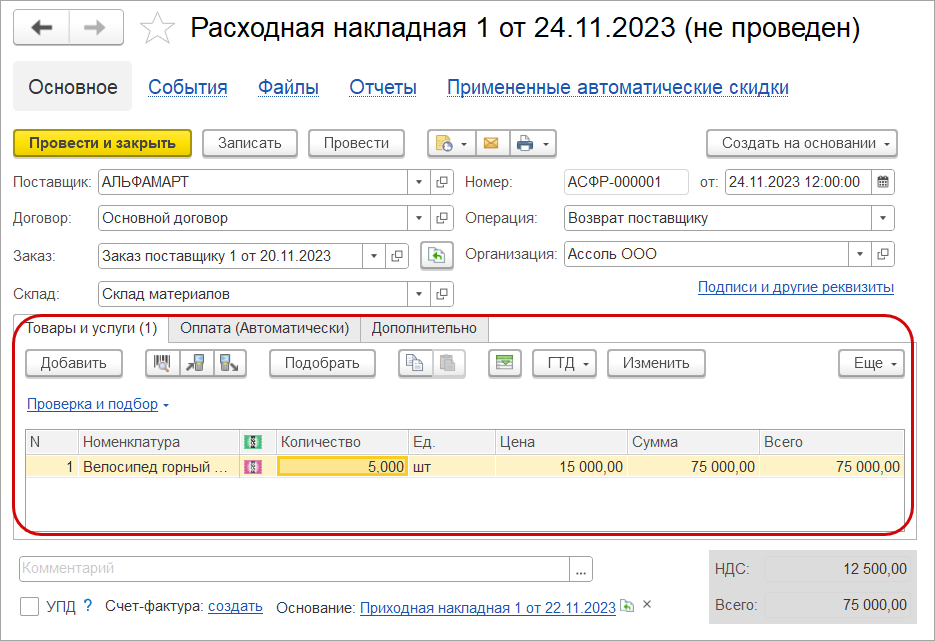Половину товара возвращаем поставщику. Для этого на основании приходной накладной создаем документ возврата. На вкладке "Товары и услуги" указываем количество и сумму возврата в размере 75 000 руб.